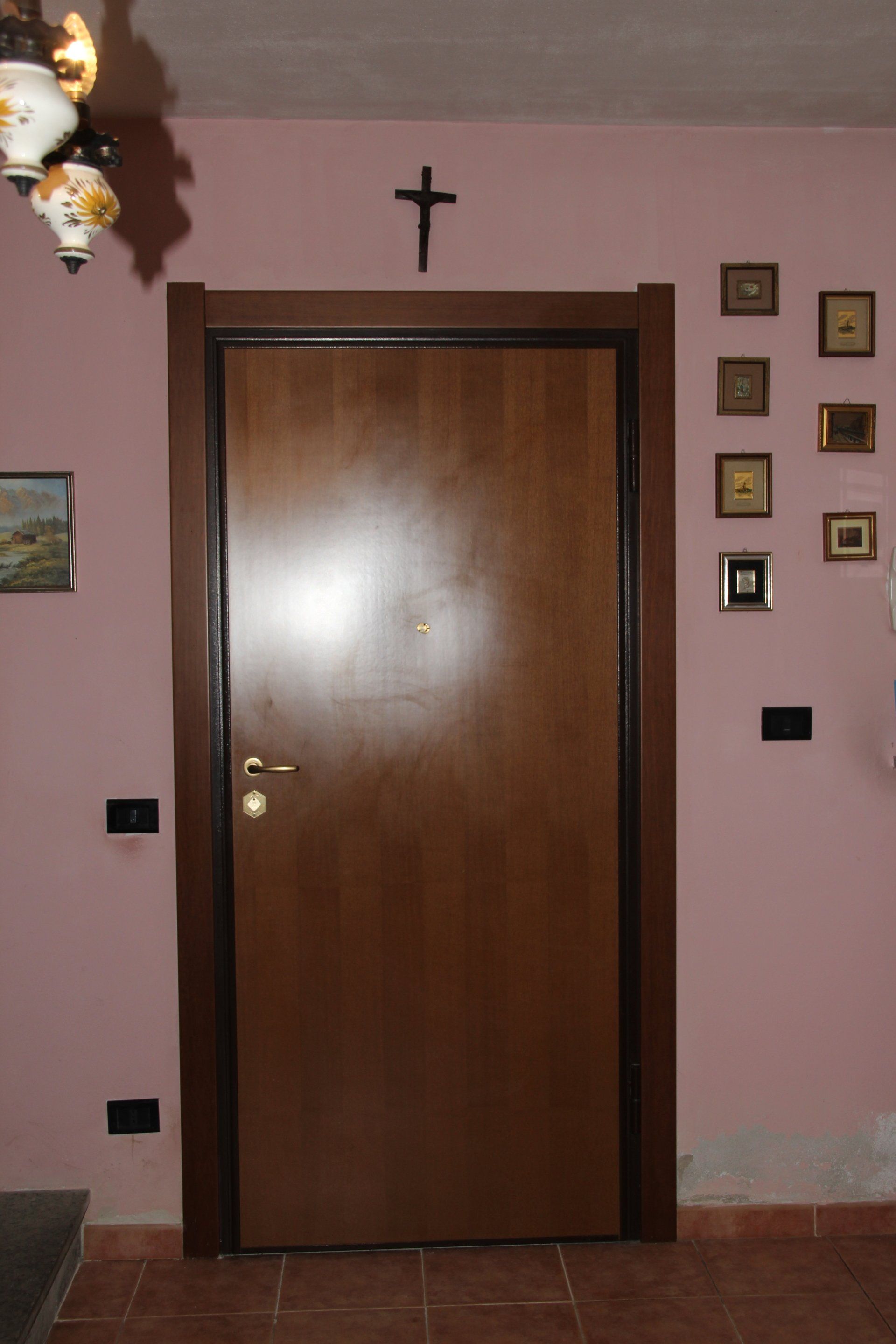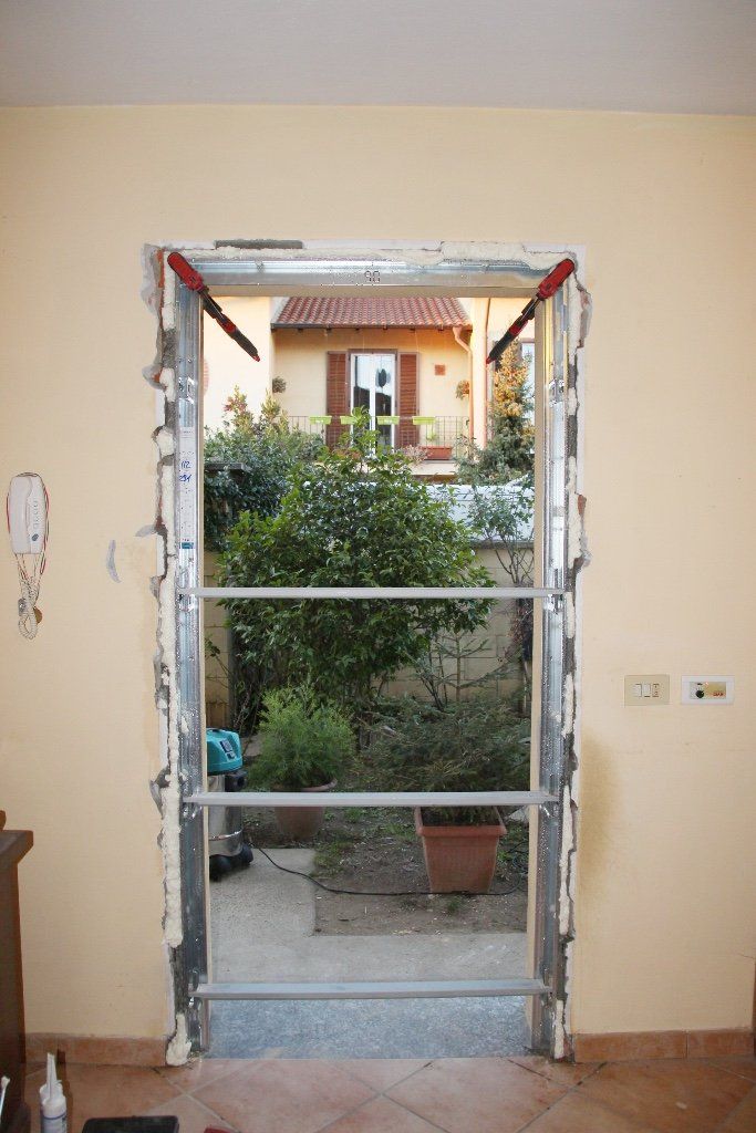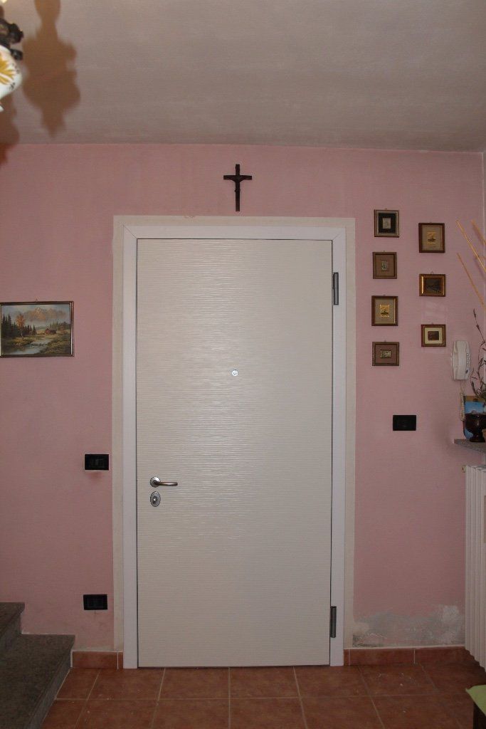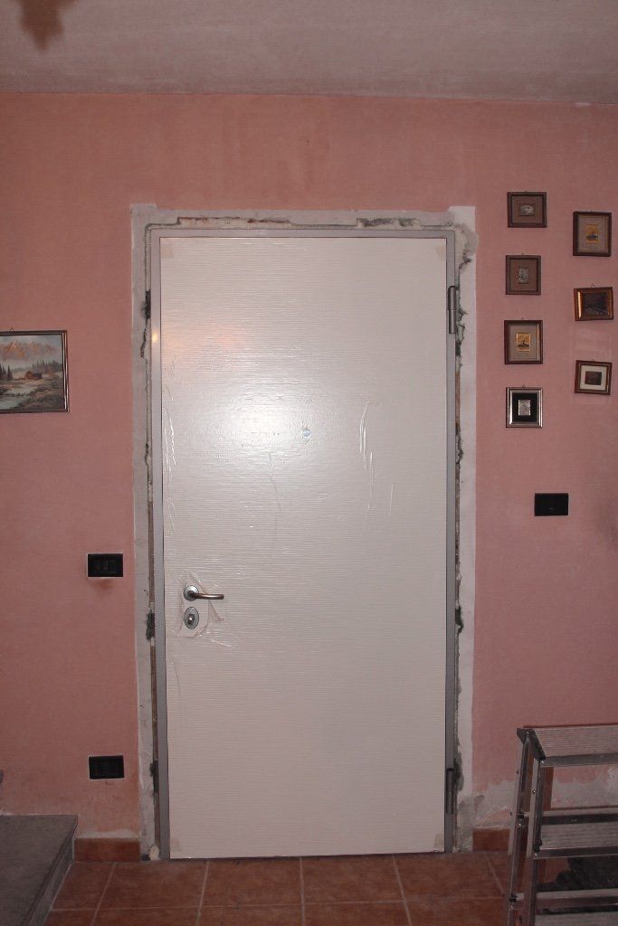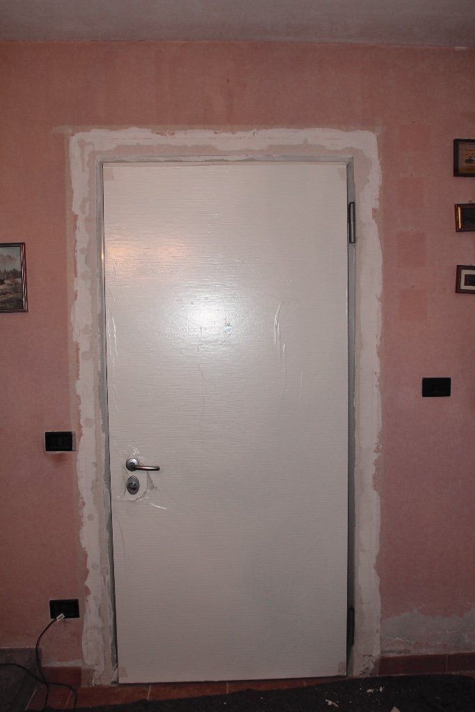Posa di porta blindata. Sottofondo con posa piastrelle e rasatura pareti.