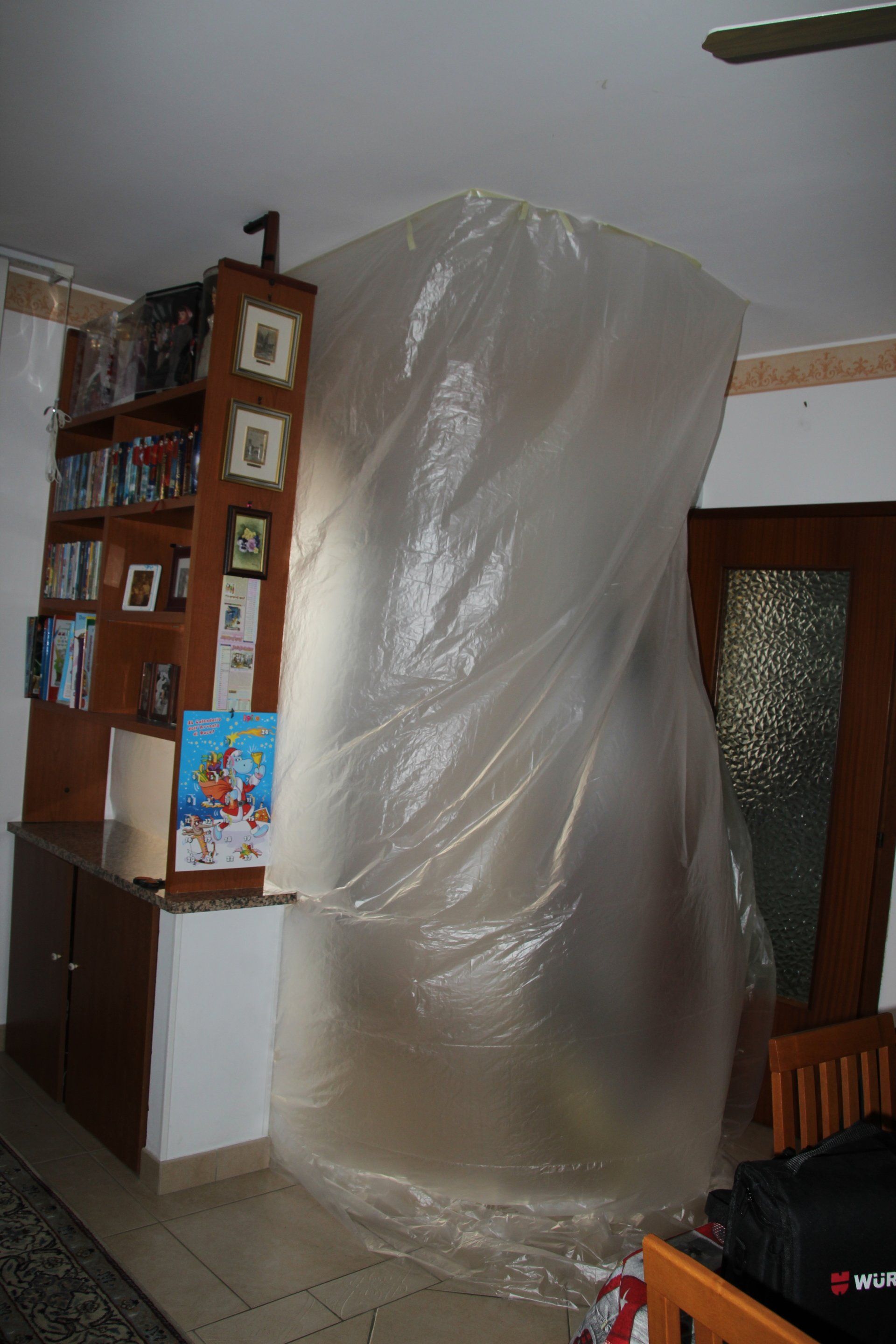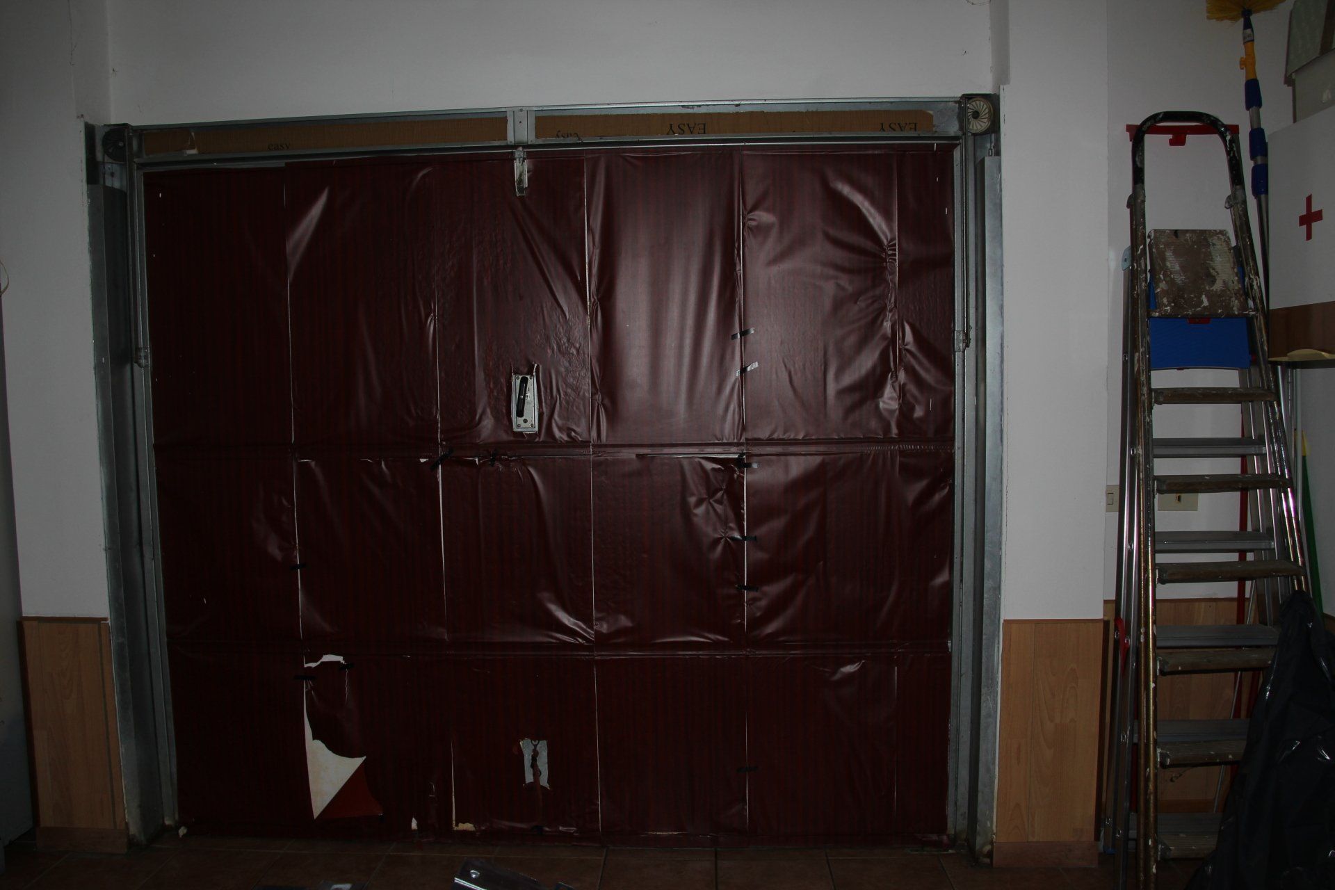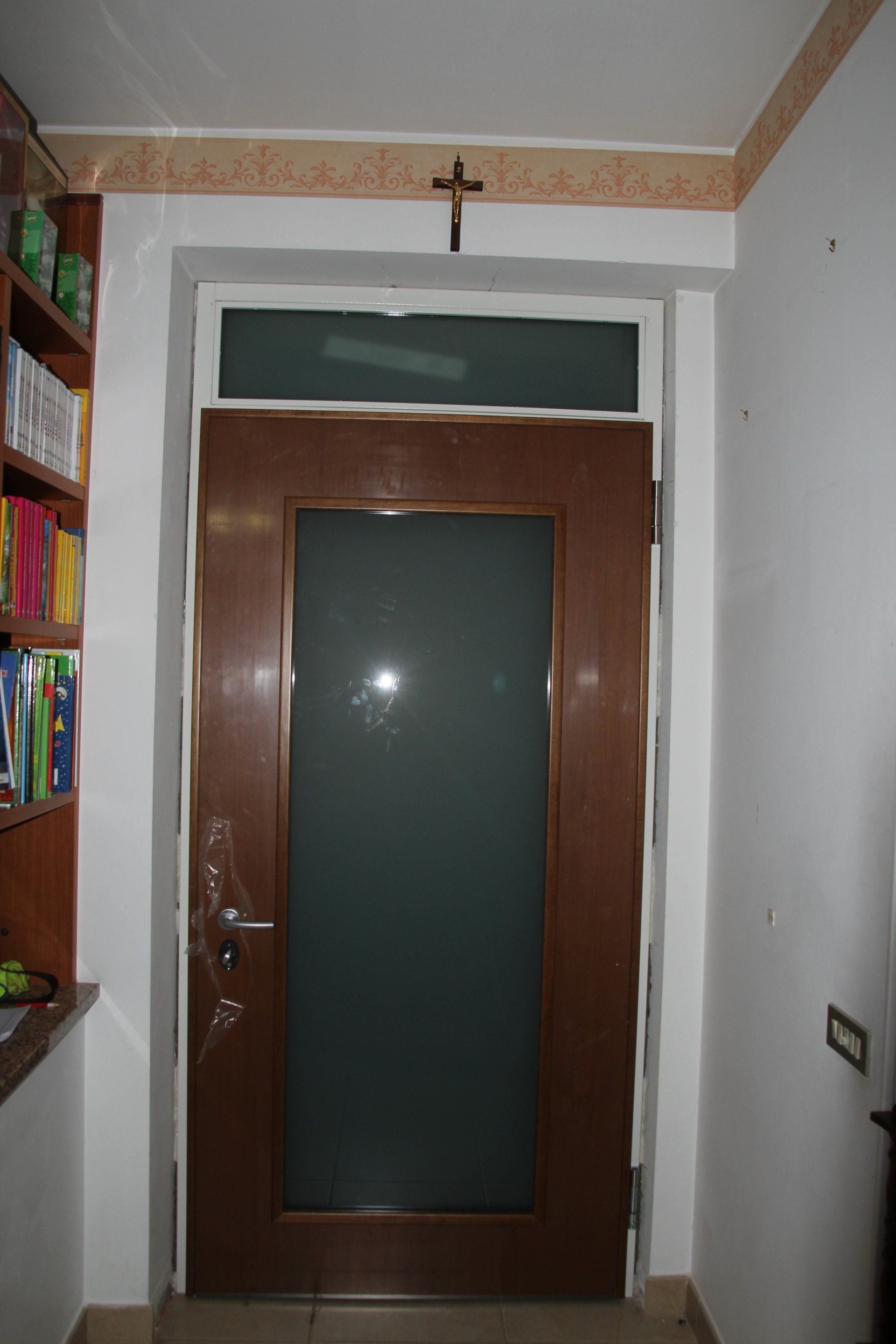 Posa di porta blindata. Sottofondo con posa piastrelle e rasatura pareti.